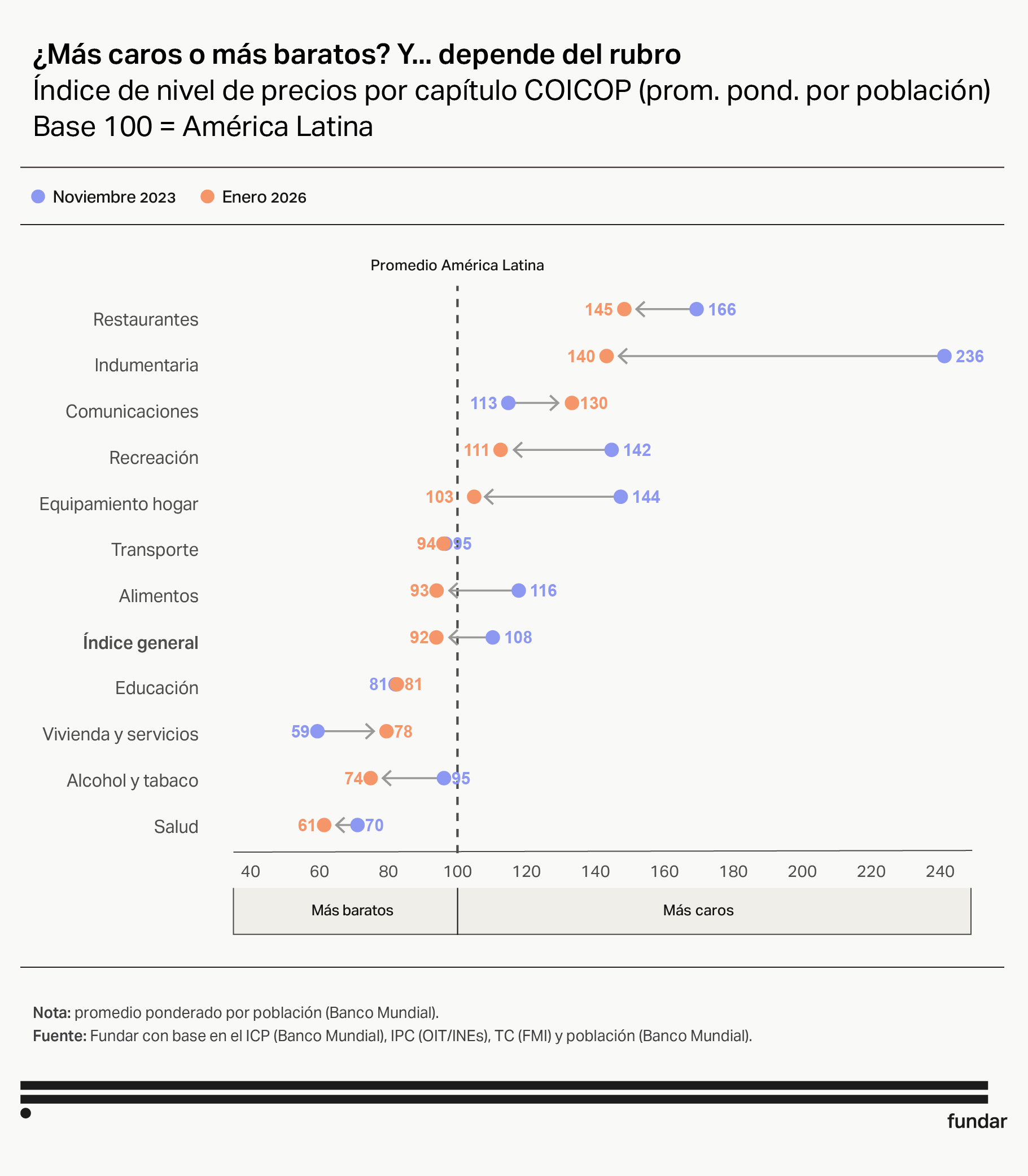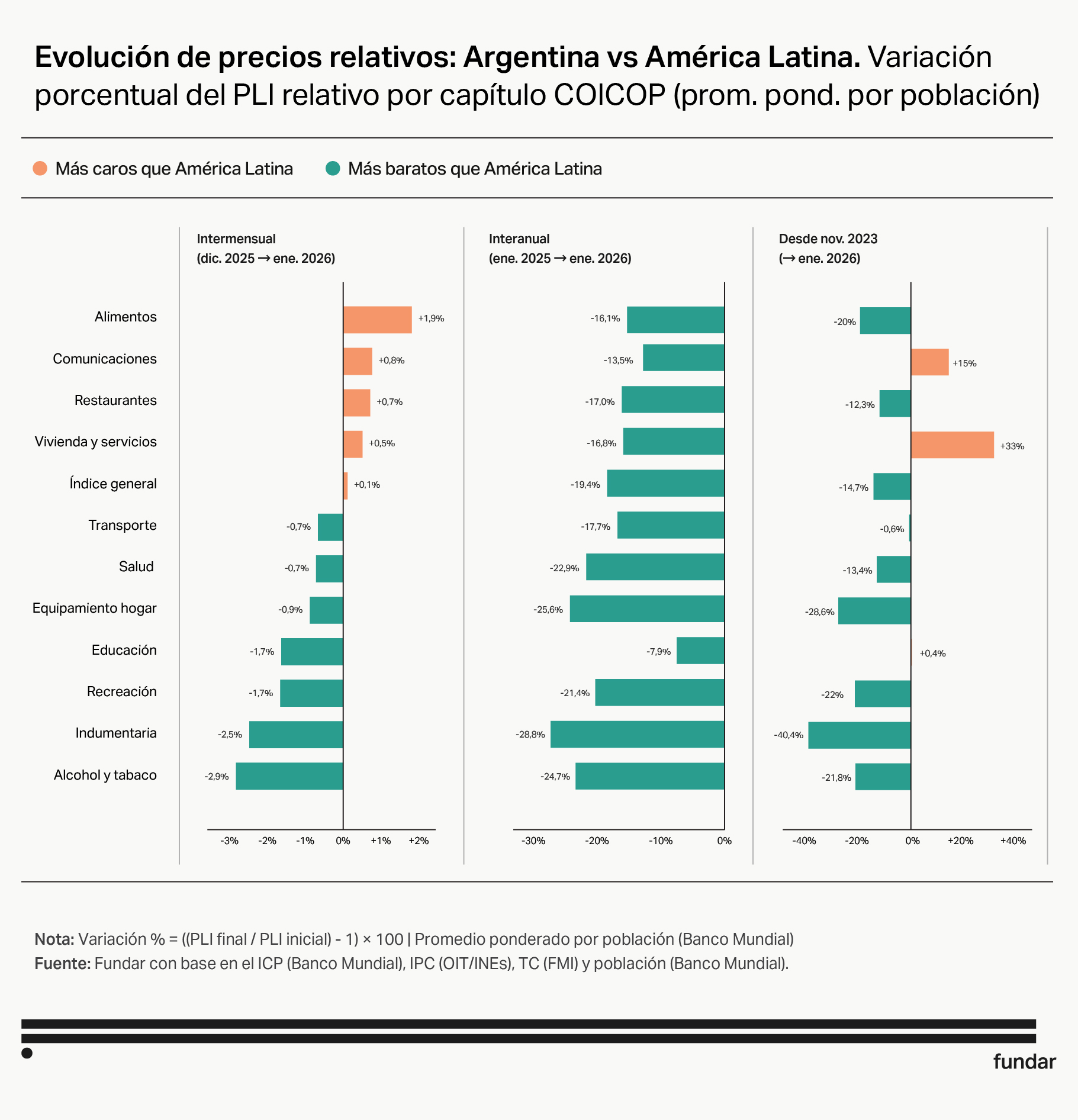 ➜ Desde noviembre de 2023, Comunicaciones, Vivienda y servicios y Educación se volvieron más caras respecto a América Latina. En el resto de los rubros nos abaratamos relativamente.
