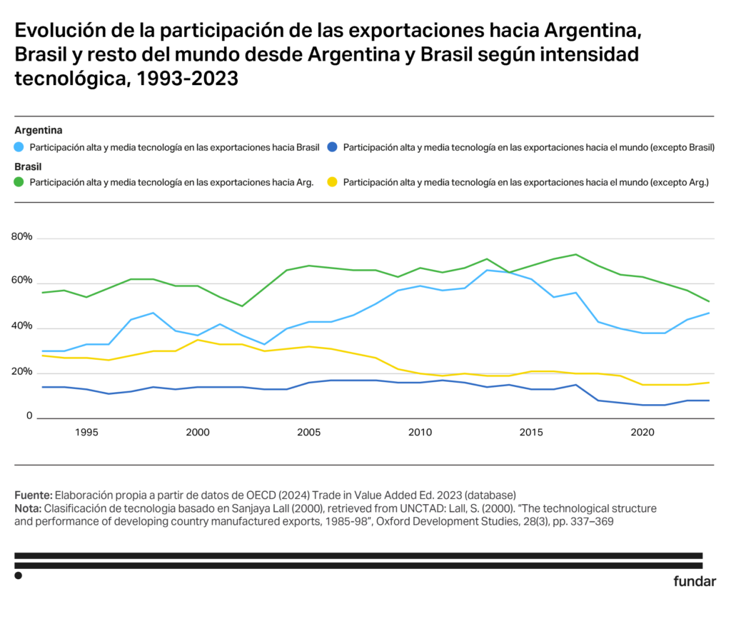 No sólo Brasil es importante para Argentina, sino que —en menor medida— Argentina también es un destino importante de las exportaciones con mayor complejidad tecnológica de Brasil. Argentina es el 5% de las exportaciones de Brasil, pero el 15% de sus ventas de bienes de tecnología media alta. Estos valores contrastan con el proceso de primarización o desindustrialización temprana que atraviesan ambas economías. Frente a ese proceso, la relación comercial bilateral sostiene una pequeña “isla” de complejidad exportadora.